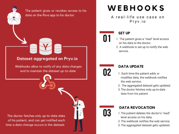 How ? The user first consents to give access to the doctor or any other third party to his data. Each time he records new data with your app, the data is added and stored on the dedicated Pryv.io platform. The webhook notifies the web service whenever a data change occurs, which automatically maintains the dataset up-to-date.
